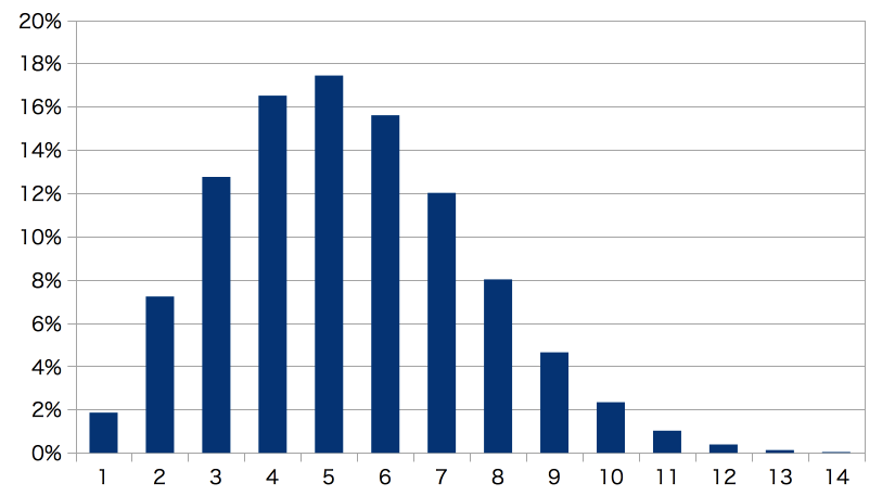 めんどうな現実から目をそらそう。時刻\(t\)における感染日別の新規感染者数を\(i(t)\)、実効再生産数を\(\mathcal{R_t}\)、世代間隔の確率密度関数を\(g\)とおくと、 \[ i(t) = \mathcal{R_t} \sum^{t-1}_{\tau=1} i(t-\tau) g(\tau) \tag{1} \] 昨日以前の新規感染者数に確率的な世代間隔をかけて合計する。さらに実効再生産数をかけると、今日の新規感染者数になる。世代間隔の確率密度関数はワイブル分布で与えられている(図1)。 \[\begin{aligned} m &= 2.345 \\ \eta &= 5.452 \\ F(\tau) &= 1 - \exp\left\{-\left(\frac{\tau}{\eta}\right)^m\right\} \\ g(\tau) &= F(\tau) - F(\tau-1) \\ \end{aligned}\] \(m\)と\(\eta\)はNishiuraら, 2020からやってきたらしい。