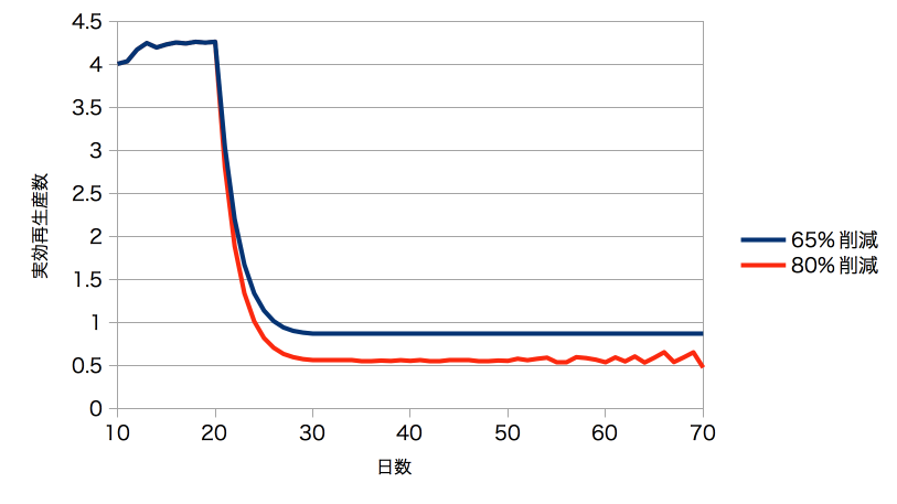 ここには、感染日別の新規感染者数のデータがある。感染日別の新規感染者数がある以上、実効再生産数が、いかんともしがたくもとまってしまう(図3)。20日めまでは実効再生産数が4.27程度で、10日程度かけてじょじょにさがっていく。80%削減では実効再生産数が0.56程度に、65%削減では実効再生産数が0.87程度におちついていく。