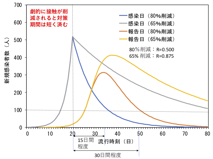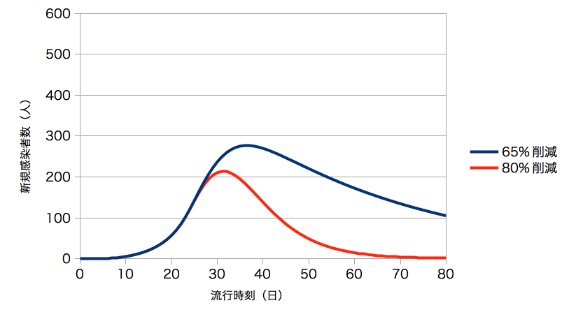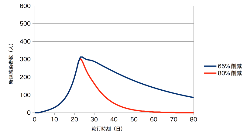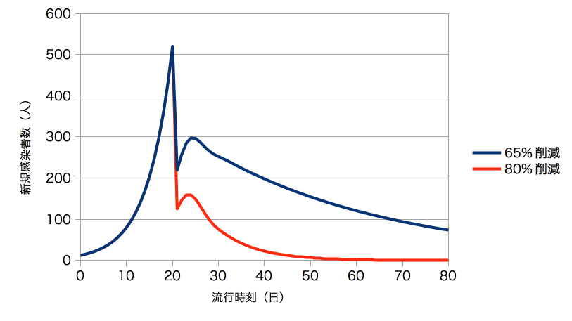 20日めまで\(\mathcal{R_t}=2.5\)で感染者数が増加し、20日めの新規感染者数がちょうど520人になる。21日めに接触機会が劇的に削減され、以降、65%削減ならば\(\mathcal{R_t}=0.875\)に、80%削減ならば\(\mathcal{R_t}=0.5\)になる。そんなありえたかもしれない感染日別の新規感染者数のポンチ絵を図4に示す。28日めには新規感染者数が100人をしたまわるような、これは計算だ。