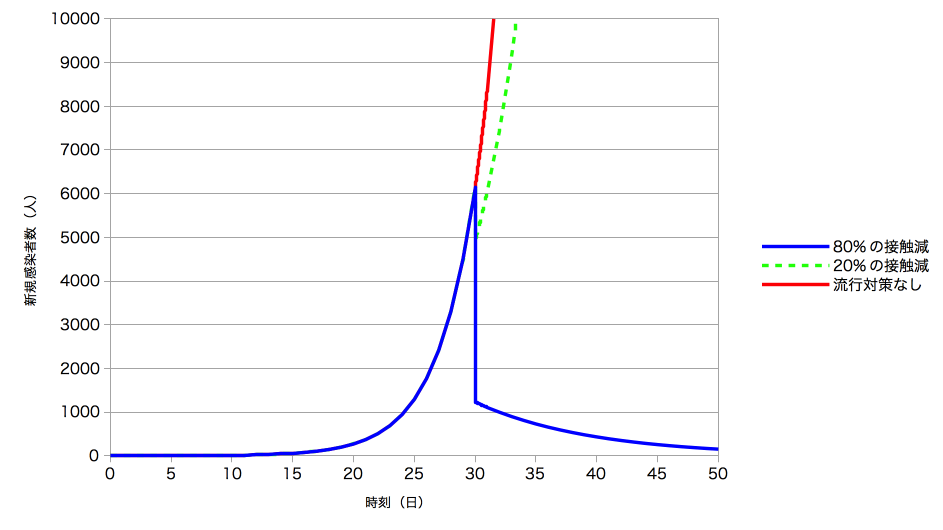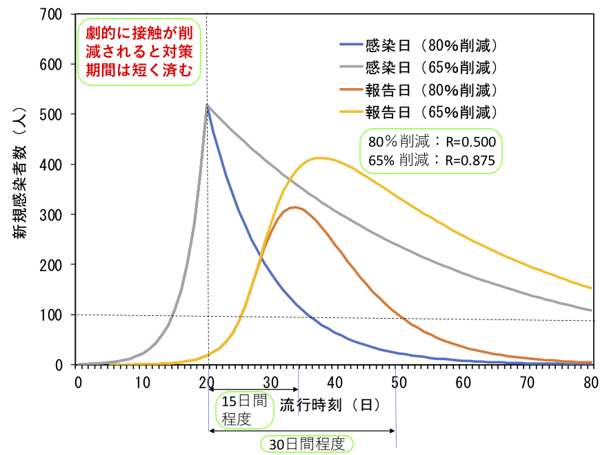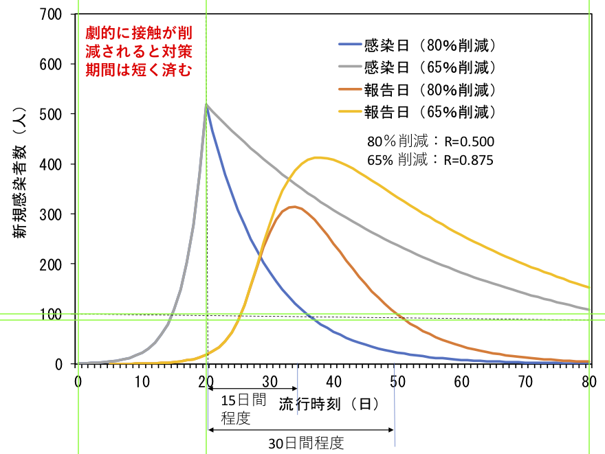 流行対策開始前までは\(\mathcal{R_0}=2.5\)で感染者数が増加する。感染日別の新規感染者数は80%の接触削減により15日間で1日100人まで減少する(青線)。しかし、接触の削減が65%であると1日100人に達するには9 日以上を要する(灰色線)。また、確定患者として報告されるにはおおよそ2週間の遅れを要し、80%削減のとき1日100人に到達するには緊急事態宣言から約1か月を要する(オレンジ線)。黄色線は65%削減のときの確定患者数である。