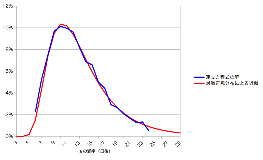 報告日別の新規感染者数を\(J(t)\)とおいて、\(u\)日後への影響を\(a_u\)で与えると、 \[ J(t) = \sum_{u} a_u I(t + u) \] 数学にはくわしくないけれど、これくらいの連立方程式なら根性で解けそうな気がする(図4の青線)。金融工学あたりで見たことがある気がする線が出てきたので、てきとうに対数正規分布をあてはめた(図4の赤線)。\(\sigma = 0.5\)として、3日めから29日めまでで累積が99%になるように調節して、それらしさをかもしだした。