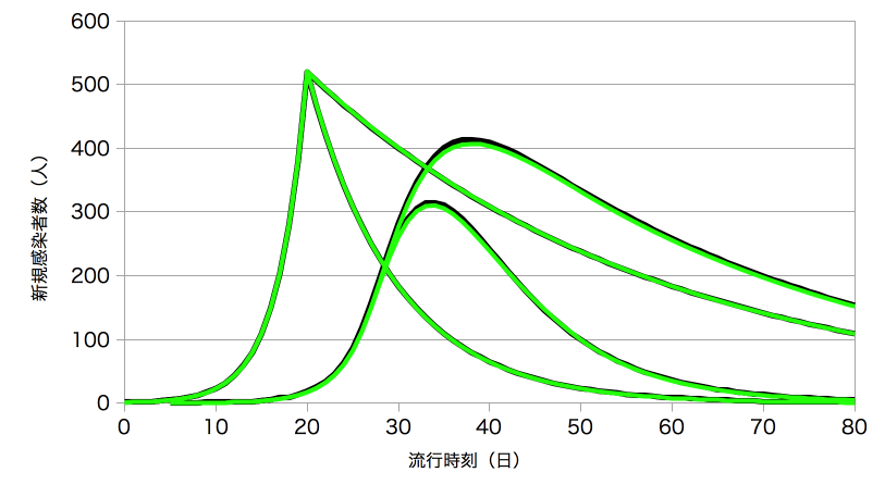 抽出結果によれば、感染日別の新規感染者数は0日めにおおよそ1人、20日めにおおよそ520人であるらしい。仮に、仮にだけど、感染日別の新規感染者数を\(I(t)\)とおくと、20日め以前は、 \[ I(t) = e^{0.3127t} \quad (0 \le t \le 20, \mathcal{R} = 2.5) \] でほどよく再現できる。21日め以降も、 \[ I(t) = \begin{cases} 520 e^{-0.1042(t-20)} &(t \gt 20, \mathcal{R} = 0.5) \\ 520 e^{-0.0261(t-20)} &(t \gt 20, \mathcal{R} = 0.875) \\ \end{cases} \] でほどよく再現できる。\(\gamma \approx 0.2085\)とおくと、 \[ I(t) = \begin{cases} e^{\gamma (\mathcal{R} - 1) t} &\, (0 \le t \le 20) \\ 520 e^{\gamma (\mathcal{R} - 1) (t - 20)} &\, (t \gt 20) \\ \end{cases} \tag{1} \] でほどよく再現できる。どこかで見たような気がするんだけど、どこで見たんだっけ(回収される伏線)。